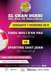 Dissabte, al pavelló de l’Institut de Sineu a les 20,00 h., es disputarà el derbi comarcal de futbol sala entre el Sineu Atl-Molí den Pau (quart classificat) i el Sporting Sant Joan (tercer classificat). Enguany, a l’equip de Sant Joan