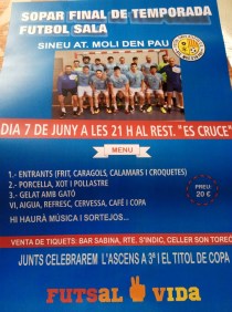 L’equip sineuer de futbol sala, el Sineu Atl-Molí den Pau, vol celebrar l’èxit rotund de la seva primera temporada amb un sopar al restaurant “Es Cruce”, el proper dijous dia 7 de juny. Celebraran l’ascens a Tercera Divisió i el