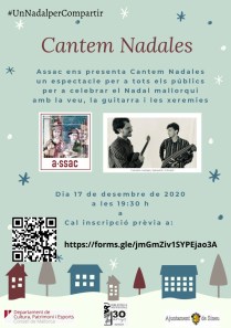 El proper 17 de desembre actuarà el grup ASSAC al Teleclub, a les 19.30 h. Es tracta d’un espectacle anomenat “Cantem nadales” que interpreten amb veu, guitarra i xeremies. És necessària la inscripció prèvia: https://forms.gle/jmGmZiv1SYPEjao3A