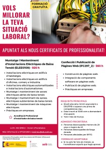 El mes de novembre, l’IES Sineu començarà a impartir els següents Certificats de Professionalitat en horari d’horabaixa: -Muntatge i manteniment d’instal·lacions elèctriques de baixa tensió (920 h): capacita per a obtenir el carnet d’instal·lador electricista. -Confecció i publicació de pàgines