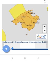 Els diferents nivells d’alerta romandran fins a divendres a migdia. En concret, a Sineu l’alerta carabassa es mantendrà entre avui i demà, divendres passarem a alerta groga. De moment els serveis meteorològics de l’AEMET han registrat prop de 60 litres