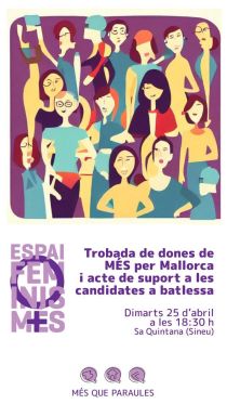 El proper dimarts 25 d’ abril a les 18:30 h a Sa Quintana, hi haurà una trobada de dones de MÉS i un acte de suport a les candidates a batlia. És un acte organitzat per l’ Espai de FeminisMés.