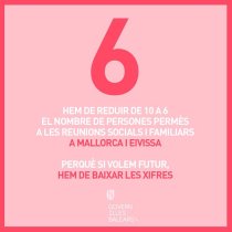 La presidenta Armengol ha anunciat avui que dissabte entrarà en vigor una mesura que limitarà a sis persones les reunions familiars o socials a Mallorca i a Eivissa. La mesura anticovid s’aplica a fi de mirar d’aplanar la corba d’incidència