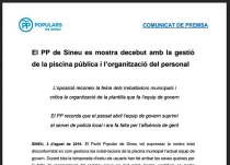El Partit Popular de Sineu ha enviat un comunicat de premsa on expressa la seva disconformitat en com gestionen les instal·lacions de la piscina municipal. Segons el comunicat del partit, “durant tota la temporada d’estiu els usuaris han fet arribar