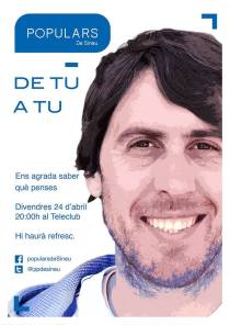 Aquest proper cap de setmana, tant el PP com Gent per Sineu organitzen actes. El PP ha organitzat un acte per aquest divendres 24, amb el lema de “de tu a tu”. El cartell que ha distribuït l’equip de Tomeu