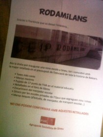 El PSIB-PSOE de Sineu també ha carregat contra el PP aprofitant la inauguració del nou CEIP Rodamilans, prevista per aquest matí. El soe ha repartit uns fulls per les cases del poble en els que es denuncia que ara el