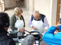 Ara mateix, a les onze i mitja, un equip d’IB3 està gravant una peça del programa dels diumenges Gent de la Mar. L’improvisat plató és el Claustre de Sant Francesc. El conegut Manolo Barahona i madò Francisca Oliver Panarera estan