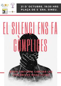 Aquest proper dimarts 21 d’octubre diverses entitats han convocat a les 19.30 h un acte reivindicatiu contra les violències masclistes sota el lema “El silenci ens fa còmplices“. Les entitats convocants són Associació Homes Transitant i Dones d’Arrel Sineu; amb