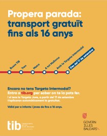 A partir d’avui s’amplia la franja d’edat dels infants que poden viatjar gratis amb el TIB. L’ampliació de la gratuïtat dels 12 als 16 anys al TIB incentivarà l’ús del transport públic pels més joves. Els menors d’aquesta franja d’edat