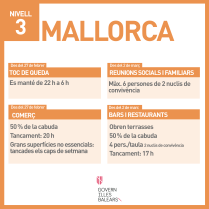Avui, el Consell de govern ha acordat les noves mesures restrictives per a cada illa segons els nous nivell de protrecció. Mallorca, que passa al nivell 3, tendrà les següents restriccions: 1- Tot i que es manté el toc de