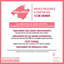 Dimarts dia 12 de gener, una vegada aprovades al Consell de govern de dilluns, entraran en vigor noves mesures restrictives degut a l’increment de contagis de coronavirus a l’illa de Mallorca. En concret, es suspendrà l’activitat de cafeteries, bars i