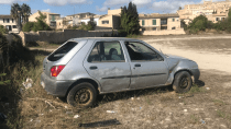Aquest cotxe de la foto du uns mesos abandonat devora la placeta del Pou Llavoner. No passa desapercebut en tant que altera considerablement la imatge i la vista del lloc: el cotxe ja està ben deteriorat, pràcticament destrossat, i és